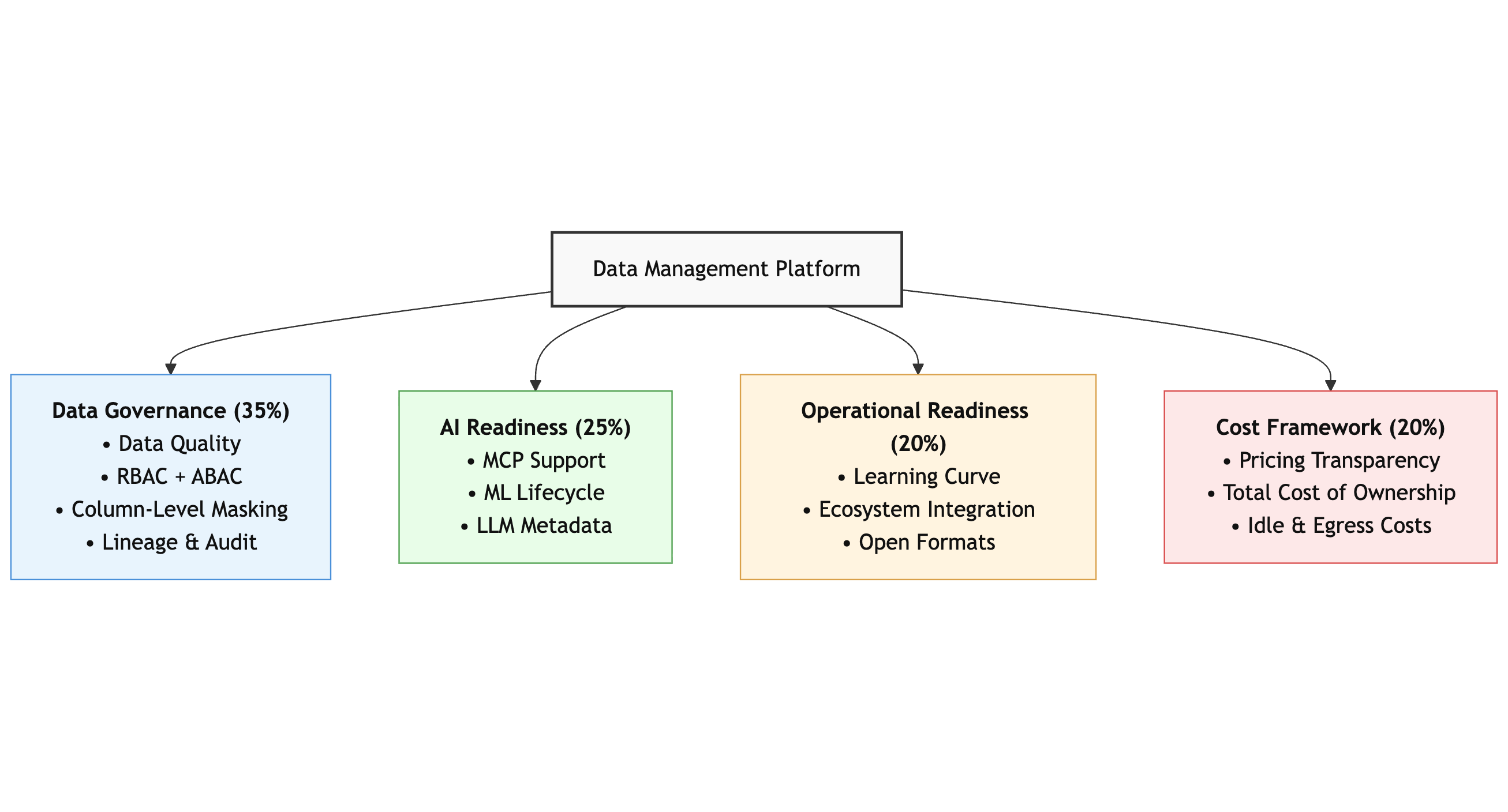 | AI Readiness | 25% | MCP and Protocol Support (8%), ML Lifecycle Integration (7%), Metadata for LLMs (5%), Agentic AI Support (5%) |