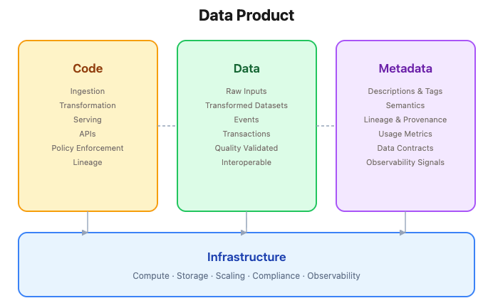 In the software world, a product ships with its code, its infrastructure, its documentation, and its interfaces. A data product applies the same thinking to data. It wraps together the data itself, the code that processes it, the metadata that gives it meaning, and the infrastructure that keeps it running.